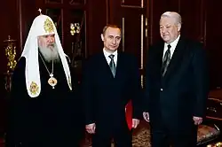 As an infant, Yeltsin was christened in the Russian Orthodox Church;[1] his mother was devout, and his father unobservant.[9] In the years after his birth, the area was hit by the famine of 1932–1933;[10] throughout his childhood, Yeltsin was often hungry.[11] In 1932, Yeltsin's parents moved to Kazan,[12] where Yeltsin attended kindergarten.[13] There, in 1934, the OGPU state security services arrested Nikolai, accused him of anti-Soviet agitation, and sentenced him to three years in the Dmitrov labor camp.[14] Yeltsin and his mother then were ejected from their residence and were taken in by friends; Klavdiya worked at a garment factory in her husband's absence.[15] In October 1936, Nikolai returned; in July 1937, the couple's second child, Mikhail, was born.[16] That month, they moved to Berezniki, in Perm Krai, where Nikolai got work on a potash combine project.[17] In July 1944, they had a third child, Valentina.[18]