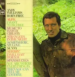 Born Free is the twentieth studio album by American pop singer Andy Williams and was released on April 10, 1967, by Columbia Records[1] and includes half a dozen songs associated with movies or musicals. Two of these tracks, however, originated in the scores of the films indicated on the album jacket but had lyrics added later: the melody for "Strangers in the Night" was written for A Man Could Get Killed, and "Somewhere My Love" began as "Lara's Theme" from Doctor Zhivago.