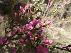 The flowers are pink to reddish and are scattered singly or in small groups in leaf axils or at the ends of the stems. The flowers are about 1 cm (0.4 in) in diameter on a stalk 4 mm (0.2 in) long. The sepals are egg-shaped to triangular, 1.5–2 mm (0.06–0.08 in) long and usually have a sharp, pointed tip. There are four glabrous petals and eight stamens.[2][3][4]