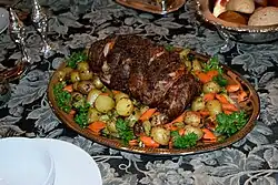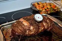 A Boston butt is the slightly wedge-shaped portion of the pork shoulder above the standard picnic cut[1] which includes the blade bone and the "lean butt" (which is boneless), both extensions of the tenderloin cut and can be used in place of the tenderloin.[2] Generally the pork shoulder is considered a primal cut with the picnic and butt sections being sub-primal cuts; however, some sources do refer to the butt as a primary cut.[3]