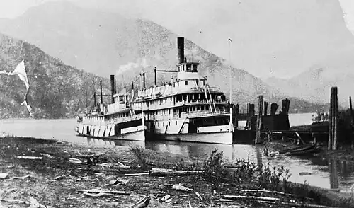 During the 1890s, mining activity peaked in the area. D. McGregor prospected on McGregor Creek. In the early 1900s, about 3 kilometres (2 mi) south at Akokli (Goat) Creek, miners worked the stream. Their rock pier for loading ore was one of the first on the east side of the lake. Mining claims were also staked at Lockhart and La France creek, respectively about 6 kilometres (4 mi) and 8 kilometres (5 mi) north of Boswell.[16] The La France Mining Co, formed in 1906, completed extensive underground tunnelling but shipped no ore before the venture collapsed during World War I.[16] Akokli Creek was the industrial heart. The Valparaiso, staked in the mid-1890s, was the most famous property. Mining continued sporadically. However, gold and silver recoveries proved uneconomic. A small aerial tramway to the lakeside was installed in the 1930s, but the mine closed in 1941.[17]
