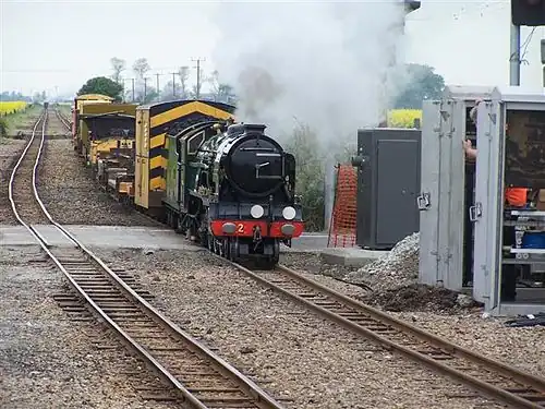 The halt was closed in 1939 due to very low traffic figures.[1] The manner of its closure was somewhat spectacular, and well reported locally at the time. Captain Howey, the railway's founder and principal shareholder, declared the station closed, instructed train drivers not to stop there, and then set fire to the wooden shelter. With no public warning of the impending closure, the flames and smoke prompted an emergency call to the Fire Brigade, who turned out an appliance and crew. The firemen were very surprised to arrive on scene and discover the burning building's owner with a box of matches.[2]