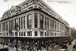 Bourne & Hollingsworth, known also in its latter days as Bournes was a large department store on the corner of Oxford Street and Berners Street. It was named after its founders, Walter William Bourne and Howard E Hollingsworth, brothers in law, who started the store in Westbourne Grove as a drapery store in 1894.[1] The store then moved to the Oxford Street site (pictured) in 1902 (built in 1894)[2] due to competition with Whiteleys,[3] and by 1928 the store had been remodelled (by Slater & Moberley) in the Art Deco style.