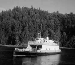 The Bowen Island ferry travels between Snug Cove on Bowen Island, and Horseshoe Bay in the District of West Vancouver, British Columbia, Canada, a trip of three nautical miles across Queen Charlotte Channel. A scheduled ferry has been in operation since 1921, when Bowen Island was a popular holiday destination. Prior to that year, transportation to the island was by steamship from Vancouver, with only one trip daily.[1] The Bowen Island ferry used a fleet of small passenger vessels until 1956, when a single car ferry began passenger service, and that ferry began carrying vehicles in 1958. In 2022 the route carried in excess of 1.2 million passengers plus 570 000 vehicles.[2]
