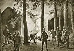 After leaving Tianjin, the force quickly reached Langfang, but the railway was destroyed there. Seymour's engineers tried to repair the line, but the force found itself surrounded, as the railway in both behind directions was destroyed. They were attacked from all sides by Chinese irregulars and imperial troops. Five thousand of Dong Fuxiang's Gansu Braves and an unknown number of Boxers won a costly but major victory over Seymour's troops at the Battle of Langfang on 18 June.[61][62] The Seymour force could not locate the Chinese artillery, which was raining shells upon their positions.[63] Chinese troops employed mining, engineering, flooding, and simultaneous attacks. The Chinese also employed pincer movements, ambushes, and sniping with some success.[64]