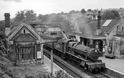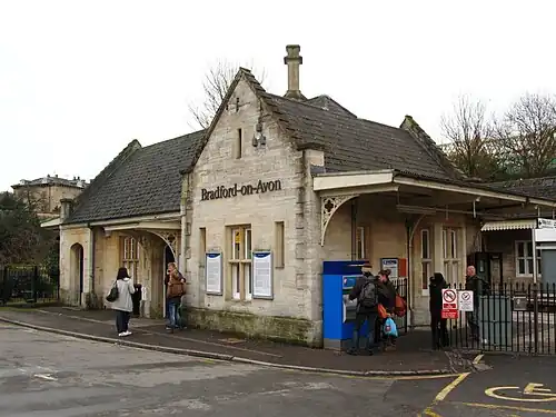 Bradford-on-Avon railway station is a railway station on the Wessex Main Line in between Avoncliff and Trowbridge, serving the town of Bradford on Avon (the station name is hyphenated, unlike the name of the town), in Wiltshire, England. The station is 9 miles 35 chains (15.2 km) south east of Bath Spa.[1] The station was originally conceived by the Wilts, Somerset and Weymouth Railway, but was not built until after the company was purchased by the Great Western Railway in 1850 and did not open until 1857.