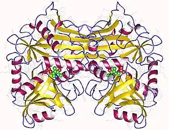 25. ^ Okada K, Hirotsu K, Sato M, Hayashi H, Kagamiyama H (April 1997). "Three-dimensional structure of Escherichia coli branched-chain amino acid aminotransferase at 2.5 A resolution". Journal of Biochemistry. 121 (4): 637–41. doi:10.1093/oxfordjournals.jbchem.a021633. PMID 9163511.
