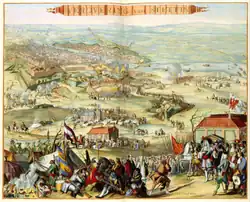 Polish king John III Sobieski planned to restore Polish suzerainty over the Duchy of Prussia, and for this purpose concluded an alliance with France on 11 June 1675.[44] France promised assistance and subsidies, while Sobieski in turn allowed French recruitment in Poland-Lithuania and promised to aid Hungarian rebel forces who were to distract the Habsburgs from their war against France.[44] For this plan to work out, Poland-Lithuania had to first conclude her war against the Ottoman Empire, which French diplomacy despite great efforts failed to achieve.[45] Furthermore, Sobieski was opposed by the Papacy, by Polish gentry who saw the Ottomans as the greater threat, and by Polish magnates bribed by Berlin and Vienna.[46] Inner-Polish Catholic opposition to an intervention on the Protestant Hungarian rebels' side added to the resentments.[47] Thus, while Treaty of Żurawno ended the Polish–Ottoman war in 1676, Sobieski sided with the emperor instead,[47] and the plan for a Prussian campaign was dropped.[46]