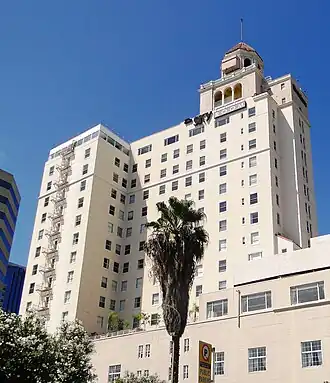 The Breakers Hotel was developed by a local Long Beach banker and capitalist, Fred B. Dunn.[4] Construction began in fall 1925, with a projected cost of $2,250,000.[4] The original structure consisted of a single-story base that spanned an entire city block with a central tower rising thirteen stories above the main body of the building. The complex also included arcade and basement floors beneath the Ocean Boulevard level.[4] The hotel's architecture was described at the time as "ultra Spanish." At the time, the total cost was said to be $3,000,000.[5][6] The building opened in September 1926 with a banquet and dinner at which Long Beach's Mayor Fillmore Condit and Fred Dunn spoke. The banquet also included a program of entertainment by vaudeville artists.[5]
