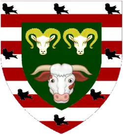 Shield of arms granted in 1955: Vert in chief two rams' heads and in base a Hereford Bull's head all caboshed Proper within a bordure harry of ten Argent and Gules charged with eight martlets Sable.[1]