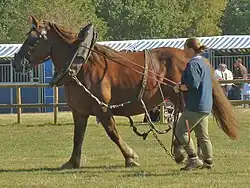 The Breton normally stands about 1.55 to 1.63 m (15.1 to 16.0 hands) at the withers, depending on type.[13] It is most commonly chestnut, flaxen chestnut or chestnut roan; bay and blue roan are less usual, and black is rare.[14]: 154 Limited white markings are tolerated.[15]: 7 The head is of medium size, the profile straight or convex; the neck is long and well set on, the shoulder long and sloped, the chest broad, the breast deep, the back broad, the croup broad and double, and the legs muscular.[15]: 7