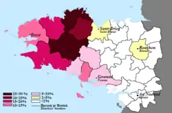 It is said that, in 1914, over one million people spoke Breton west of the boundary between the Breton and Gallo-speaking region—roughly 90% of the population of the western half of Brittany. In 1945, Breton speakers consisted about 75% of the population. In 2018, a study commissioned by the administrative region of Brittany (Loire-Atlantique included) revealed that 5.5% of Bretons considered that they spoke the language (around 213,000 people).[13] In 2024, according to a new study, 2.7% of people surveyed said they spoke Breton very well or fairly well (around 107,000 people). However, the average age of Breton speakers has fallen from 70 in 2018, to 58.5 in 2024.[14]