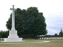 ![]() The war stone in the centre of Bretteville-sur-Laize Canadian War Cemetery. The Cross of Sacrifice is visible in the background. | |
