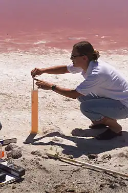A NASA technician measures the concentration level of brine using a hydrometer at a salt evaporation pond in San Francisco.
