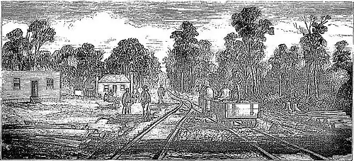The tramway was 2 ft. 6 in. gauge laid with peppermint wood rails (from the Don River) and stringy bark sleepers.[53]