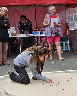 The championships are organized by the British Marbles Board of Control (BMBC)[15] and the version of marbles played is Ring Taw, known in the United States as "Ringer" [16] and in Germany as "Englisches Ringspiel". Forty-nine target marbles are grouped closely together in 6-foot diameter (1.8-metre)[17] raised concrete ring covered with sand, each of the target marbles being a coloured glass or ceramic sphere having a diameter of approximately 12mm (half an inch).[16]