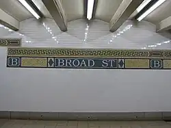 The station originally had red tile bands, similar to those used on the Independent Subway System.[50][51] This station was renovated in the late 1990s and a mosaic design was added to the platform walls. Beneath a small green and gold trim-line is a larger gold trim-line with a maroon border and white "B" and "BROAD ST" tablets on a blue-green background at regular intervals.[52]