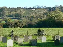 Broad Town White Horse is carved facing west on a long, grass-laden, 45° steep slope (450 metres above mean sea level) above the Little Town Farmhouse that is situated half a mile outside the village of Broad Town.[3] The hill that the horse is cut on used to belong to the farm,[4] and is located on the most western limit of the same escarpment where Uffington White Horse is cut, overlooking the farthest end of the Vale of the White Horse.[5] The horse is 60 feet (18 metres) in height and 80 feet (24 metres) in length,[6] and is "composed of fine compacted chalk."[3] It is the third smallest of the eight canonical white horses in Wiltshire.[6] The horse ties "neck-and-neck" with Hackpen White Horse as the closest white horse to Swindon.[7]