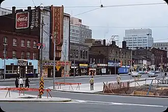 When New City Hall was to be built on the north side of the street, politicians felt that the Broadway and the Casino Theatre, another Burlesque theatre just five doors west, pawn shops and the block's other businesses were inconsistent with civic dignity, and the whole block was expropriated and demolished in 1965.[1] Following a two year construction, from fall 1972, the block became the site of the large Four Seasons Sheraton Hotel (since rebranded as Sheraton Centre Toronto Hotel). At the far corner was an office block with a Toronto Dominion Bank branch, which was also demolished and replaced with a low rise glass pavilion housing a TD Bank.