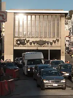 A stylized dragon relief sculpture by Patti Bowler, rendered in bronze, has been mounted above the eastern portal of the tunnel since 1969.[19][20] The building atop the eastern portal is the Chinatown Public Health Center (Chinese: 華埠公共衛生局), a public health clinic operated by the San Francisco Department of Public Health.[21] It was built in the 1970s and remodeled in 2010.[22]