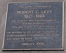 The Broadway Tunnel was named in honor of Robert C. Levy (1921–1985) in January 1986. Levy was the city engineer and superintendent of building inspection for the City and County of San Francisco. A plaque outside the tunnel reads, "He devoted his life to high standards of professionalism in engineering and to the City which he loved."