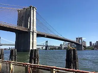 View of the Brooklyn Bridge from Manhattan; the East River is in the foreground