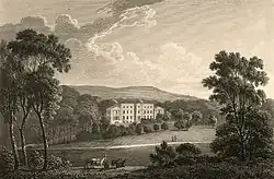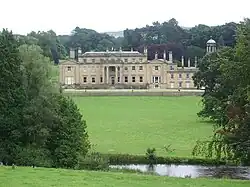 The hall is a Grade I listed building[1] and has been the seat of the Tempest Baronets for 900 years and, although the baronetcy is extinct, it is still run by a direct descendant of the Tempest family. A 14th-century document records the acquisition of a house, watermill and part of the manor of Broughton by Sir John Tempest. The oldest parts of the current building date to 1597, and it was altered in 1755. The pedimented end wings were added to the main structure for Stephen Tempest, 1809–11, to designs by William Atkinson. Sir Charles Tempest, Bt. (1794–1865) refaced the north front in golden Kendal stone and added a portico, 1838–41, to designs by George Webster, an architect of the dynasty of masons at Kendal (Cumbria).[2][1] A conservatory was added in 1853.[1] The park was landscaped in the 18th and 19th centuries and the Italianate terraced garden designed by William Andrews Nesfield c. 1855.