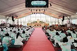 In Indonesia, the annual Asalha Puja (Indonesian: Asalha) celebration is also centered at Borobudur Temple, where it incorporates the Indonesia Tipiṭaka Chanting (ITC). Initiated in 2015, this event usually spans three days during which devotees recite passages from the Pali Canon in the Pali language and undertake the Eight Precepts. The celebration culminates in a grand puja procession where thousands of participants mindfully walk from Mendut to Borobudur, commemorating the Buddha's first sermon.[38][39]