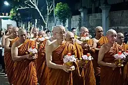 Theravādin monks under the auspices of the Indonesian Theravada Sangha celebrating Vesak Day with puja at the Sikkhādama Santibhūmi Training Center, Tangerang City, West Java, Indonesia.