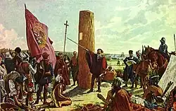 Juan de Garay founding Buenos Aires in 1580. The initial settlement, founded by Pedro de Mendoza, had been abandoned since 1542.