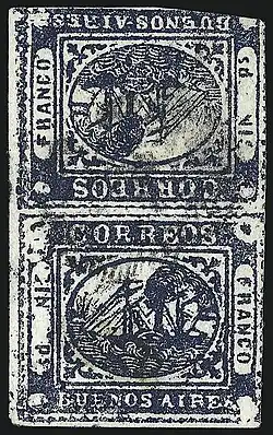 The Buenos Aires 1859 1p "In Ps" tête-bêche pair, also known as the “In Peso” tête-bêche Pair, is the only known specimen of an inverted error on Barquitos postage stamp issued by the sovereign state of Buenos Aires.[2]