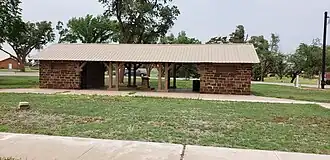 It is a 52 by 20 feet (15.8 m × 6.1 m) structure made of wood and coursed native stone, including two bathrooms at each end and an open pavilion area in the middle, built as a Works Progress Administration project. It was deemed: