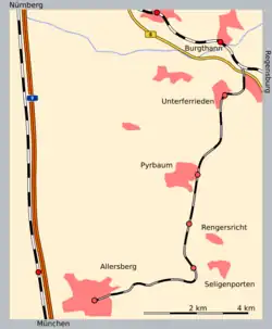 The Burgthann–Allersberg railway was a ca. 15 kilometre long Lokalbahn or branch line in Bavaria, southern Germany, that began at Burgthann on the Nuremberg–Regensburg main line.