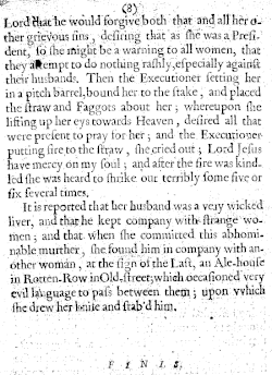A pamphlet detailing the burning in April 1652 of Joan Peterson, the so-called Witch of Wapping, also describes the execution of Prudence Lee, found guilty of mariticide. Lee was apparently brought on foot, between two sheriff's officers and dressed in a red waistcoat, to the place of execution in Smithfield. There she confessed to having "been a very lewd liver, and much given to cursing and swearing, for which the Lord being offended with her, had suffered her to be brought to that untimely end". She admitted to being jealous of and arguing with her husband, and stabbing him with a knife. The executioner put her in a pitch barrel, tied her to the stake, placed the fuel and faggots around her and set them alight. Lee was reported to have "desired all that were present to pray for her" and, feeling the flames, "shrike[d] out terribly some five or six several times."[16] Burning alive for murder was abolished in 1656, although burning for adultery remained.[17] Thereafter, out of mercy, the condemned were often strangled before the flames took hold. Notable exceptions to this practice were the burnings in 1685 and 1726 of Elizabeth Gaunt, found guilty of high treason for her part in the Rye House Plot,[7] and Catherine Hayes, for petty treason. Hayes apparently "rent the air with her cries and lamentations"[18] when the fire was lit too early, preventing the executioner from strangling her in time. She became the last woman in England to be burned alive.[19]