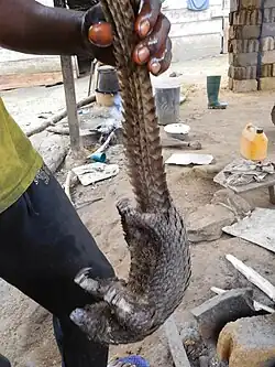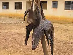 Primate species offered fresh and smoked in 2009 at a wildlife market by Liberia's Cavally River included chimpanzee (Pan troglodytes), Diana monkey (Cercopithecus diana), putty-nosed monkey (C. nictitans), lesser spot-nosed monkey (C. petaurista), Campbell's mona monkey (C. campbelli), sooty mangabey (Cercocebus atys), king colobus (Colobus polykomos), olive colobus (Procolobus verus), western red colobus (P. badius). Duiker species constituted more than half of the total 723 animals offered.[15] In 2012, the bushmeat trade was surveyed in three villages in the Sassandra Department, Ivory Coast. During six months, nine restaurants received 376 mammals and eight reptiles, including dwarf crocodile (Osteolaemus tetraspis), harnessed bushbuck (Tragelaphus scriptus), Maxwell's duiker (Philantomba maxwellii), bay duiker (Cephalophus dorsalis), Campbell's mona monkey, lesser spot-nosed monkey, potto (Perodicticus potto), tree pangolin (Phataginus tricuspis), long-tailed pangolin (P. tetradactyla), African brush-tailed porcupine (Atherurus africanus), giant pouched rat (Cricetomys gambianus), greater cane rat (Thryonomys swinderianus), striped ground squirrel (Xerus erythropus) and western tree hyrax (Dendrohyrax dorsalis).[16] About 128,400 straw-coloured fruit bats (Eidolon helvum) were estimated in 2011 to be traded as bushmeat every year in four cities in southern Ghana.[17]