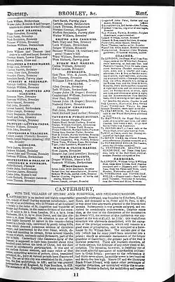 An example page from Pigot's 1839 directory of businesses in the counties of Kent, Surrey and Sussex in England.