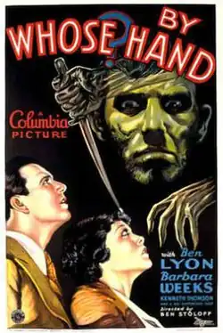 By Whose Hand? is a 1932 American mystery film directed by Benjamin Stoloff and starring Ben Lyon, Barbara Weeks and Kenneth Thomson.[1]