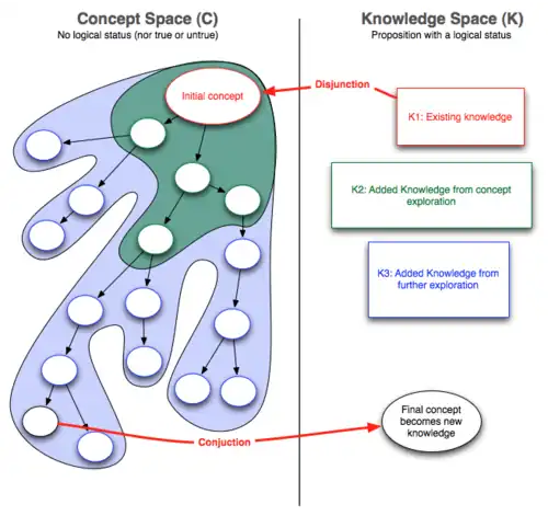 The knowledge space is defined as a set of propositions with a logical status, according to the knowledge available to the designer or the group of designers. The knowledge space (i.e. K-Space) describes all objects and truths that are established from the point of view of the designer. Then K-Space is expandable as new truths may appear in it as an effect of the design process. Conversely, the structure and properties of the K-Space have a major influence on the process.[8]
