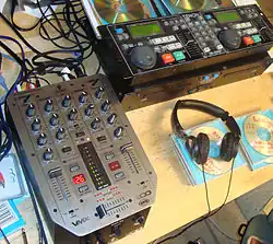 Disc jockeys (DJs) who are playing a mix of songs at a dance club, rave, or nightclub create their dance mixes by having songs playing on two or more sound sources and using a DJ mixer to transition seamlessly between songs. In the 1970s disco era, DJs typically used two record players.[68] From the 1980s to the 1990s, two compact cassette players became a popular sound source for DJs.[69] In subsequent decades, DJs shifted to CDs and then to digital audio players. DJs who use CDs and CD players typically use specialized DJ CD players (such as CDJs) that have features not available on regular CD players, such as pitch control.