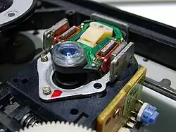 The swing-arm mechanism has a distinctive advantage over the other in that it does not skip when the rail becomes dirty. The swing arm mechanisms tend to have a much longer life than their radial counterparts. The main difference between the two mechanisms is the way they read the data from the disc. The swing-arm mechanism uses a magnetic coil wound over a permanent magnet to provide the tracking movement to the laser assembly in a similar way a hard drive moves its head across the data tracks. It also uses another magnetic movement mechanism attached to the focusing lens to focus the laser beam on the disc surface. By operating the tracking or the focus actuators, the laser beam can be positioned on any part of the disc. This mechanism employs a single laser beam and a set of four photodiodes to read, focus and keep track of the data coming from the disc.[56]