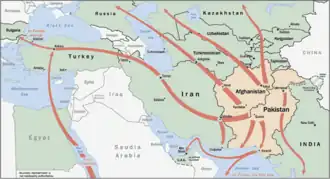 While Herat is not the highest-volume area of opium trade, Herat, and the other Iranian border areas of Farah, and Nimroz, have some of the highest prices, presumably due to demand from the Iranian market.[30] "Opium prices are especially high in Iran, where law enforcement is strict and where a large share of the opiate consumption market is still for opium rather than heroin. Not surprisingly, it appears that very significant profits can be made by crossing the Iranian border or by entering Central Asian countries like Tajikistan."