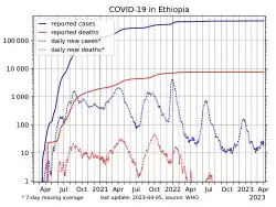 The COVID-19 pandemic in Ethiopia was a part of the worldwide pandemic of coronavirus disease 2019 (COVID-19) caused by severe acute respiratory syndrome coronavirus 2 (SARS-CoV-2). The virus was confirmed to have reached Ethiopia on 13 March 2020.[3] The national government, led by Prime Minister Abiy Ahmed, declared a five-month state of emergency in April 2020 but has allowed economic activities to continue during the public health crisis.[4]
