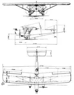 Its tailplane was unswept, with constant chord and angled tips, and was mounted on top of the fuselage, braced from below with pairs of struts. It carried narrow-chord elevators. The fin was broad and almost triangular and mounted a vertically edged, unbalanced rudder which reached down to the keel. The incidence of both fin and tailplane could be adjusted in flight to compensate for changes in centre of gravity or throttle setting.[1]