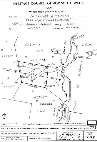 1. ^ a b c d e f g h i j "Cadia Engine House & Surrounds". New South Wales State Heritage Register. Department of Planning & Environment. H00779. Retrieved 2 June 2018. Text is licensed by State of New South Wales (Department of Planning and Environment) under CC BY 4.0 licence.