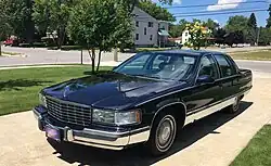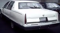 1993–1994 Cadillac Fleetwood, rear. The model line is among the final GM vehicles produced with a fuel-fill location behind the license plate.