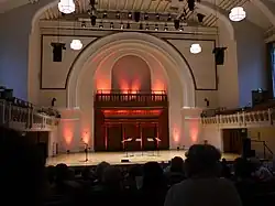 The church had a three-manual pipe organ built by J. W. Walker & Sons Ltd in 1907 and installed in 1911.[12] It was on a raised position on the platform. The organ was removed in 2004, and the pipes in 2006.[12] The original intention had been to install the organ in a church in the Midlands,[10] but instead, in 2009-10, it was installed in Christ the King Catholic Church in Gothenburg, Sweden.[12] Walker's organ case remains in place in the concert hall.[13]