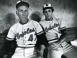 After that, Ripken hit well for the rest of the season.[43] On May 29, Ripken did not play the second game of a doubleheader, the last time he missed a game until 1998.[44] On July 1, Weaver decided to permanently shift Ripken to shortstop, deciding that it was harder to find a shortstop who could hit than it was to find a third baseman who could hit.[45] Weaver said, "You never know. Rip might be a great shortstop."[45] Ripken hit 28 home runs that year en route to winning the American League (AL) Rookie of the Year Award.[46] Aided by Ripken, the Orioles contended for the playoffs until they lost to the Milwaukee Brewers on the final day of the season.[47]