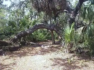 Nature trail with large live oak limb, a Sabal palm, and saw palmettos on both sides of the path