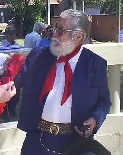 1979 winner of the Calhandra de Ouro with the song Esquilador (sheep shearer), Telmo de Lima Freitas, pictured wearing full traditional Brazilian Gaucho regalia