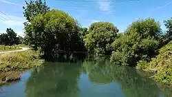 The Cam / Ruataniwha rises just to the east of the town of Rangiora and flows south across the Canterbury Plains towards Kaiapoi.[1] It has two named tributaries, North Brook and South Brook, both of which rise in Rangiora, plus several unnamed streams and drainage canals.